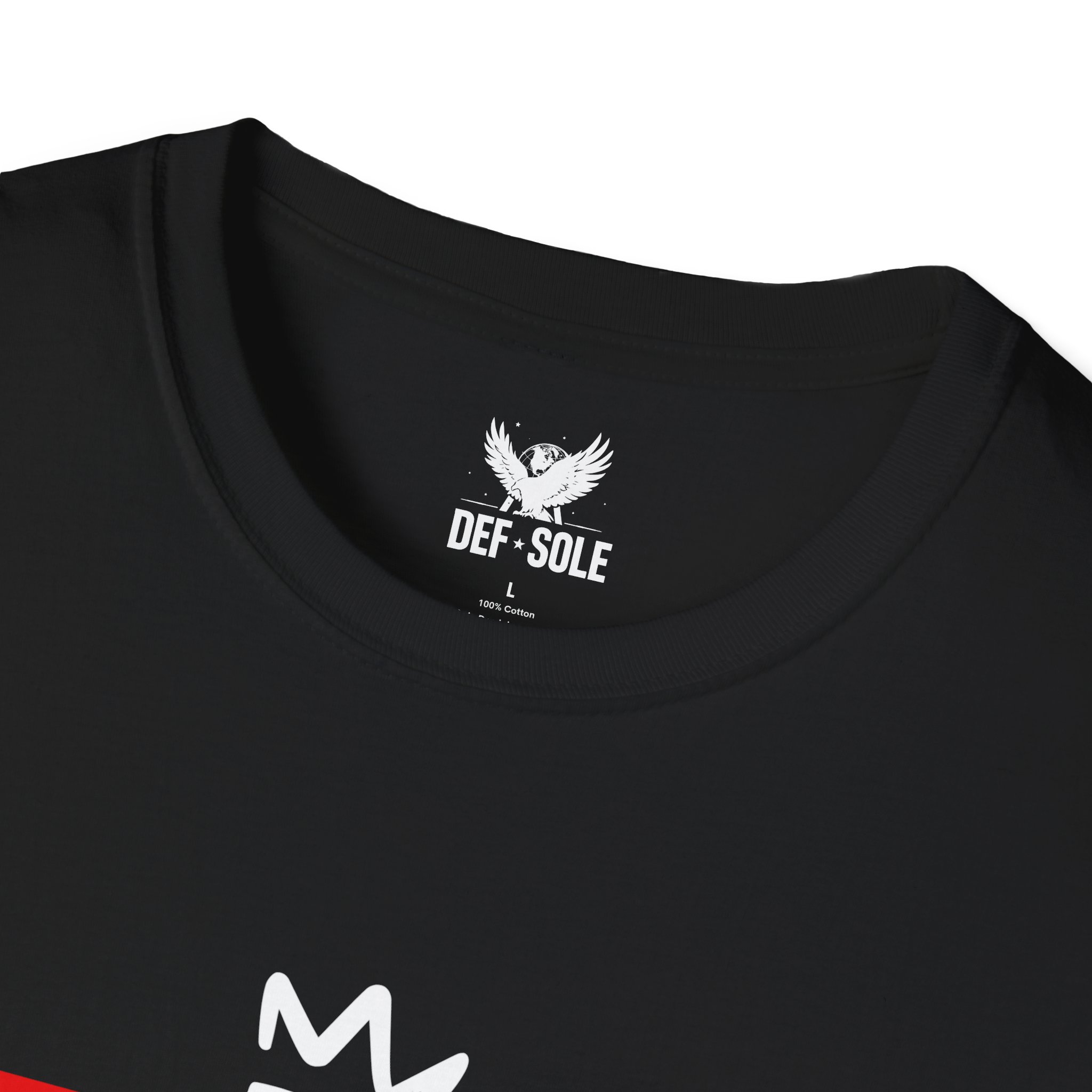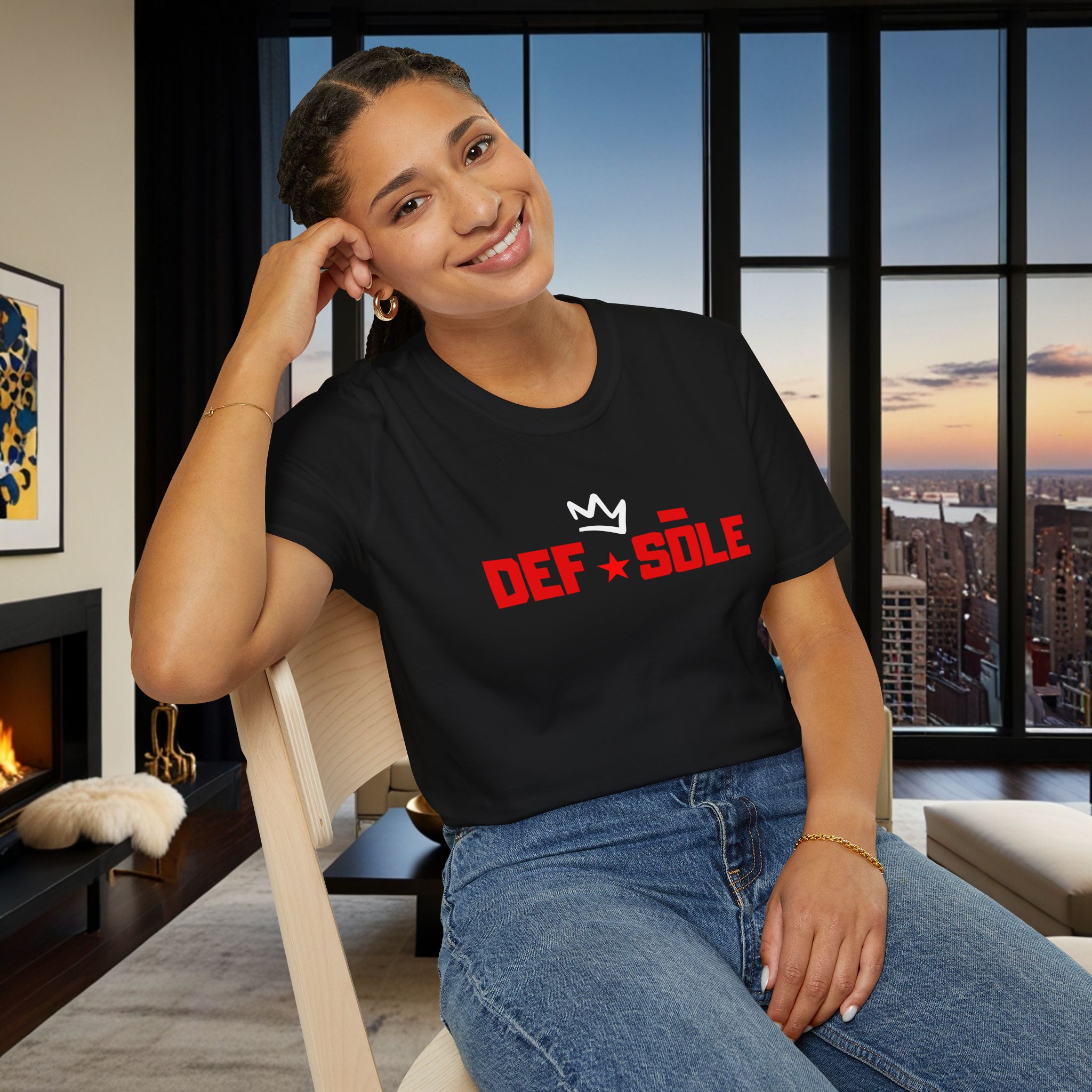 Def Sole Sneaks company Tees. Made from very soft materials, this tee is 100% cotton for solid colors. Heather colors and sports grey include polyester. The shoulders have twill tape for improved durability. There are no side seams. The collar is made with ribbed knitting to prevent curling damage.