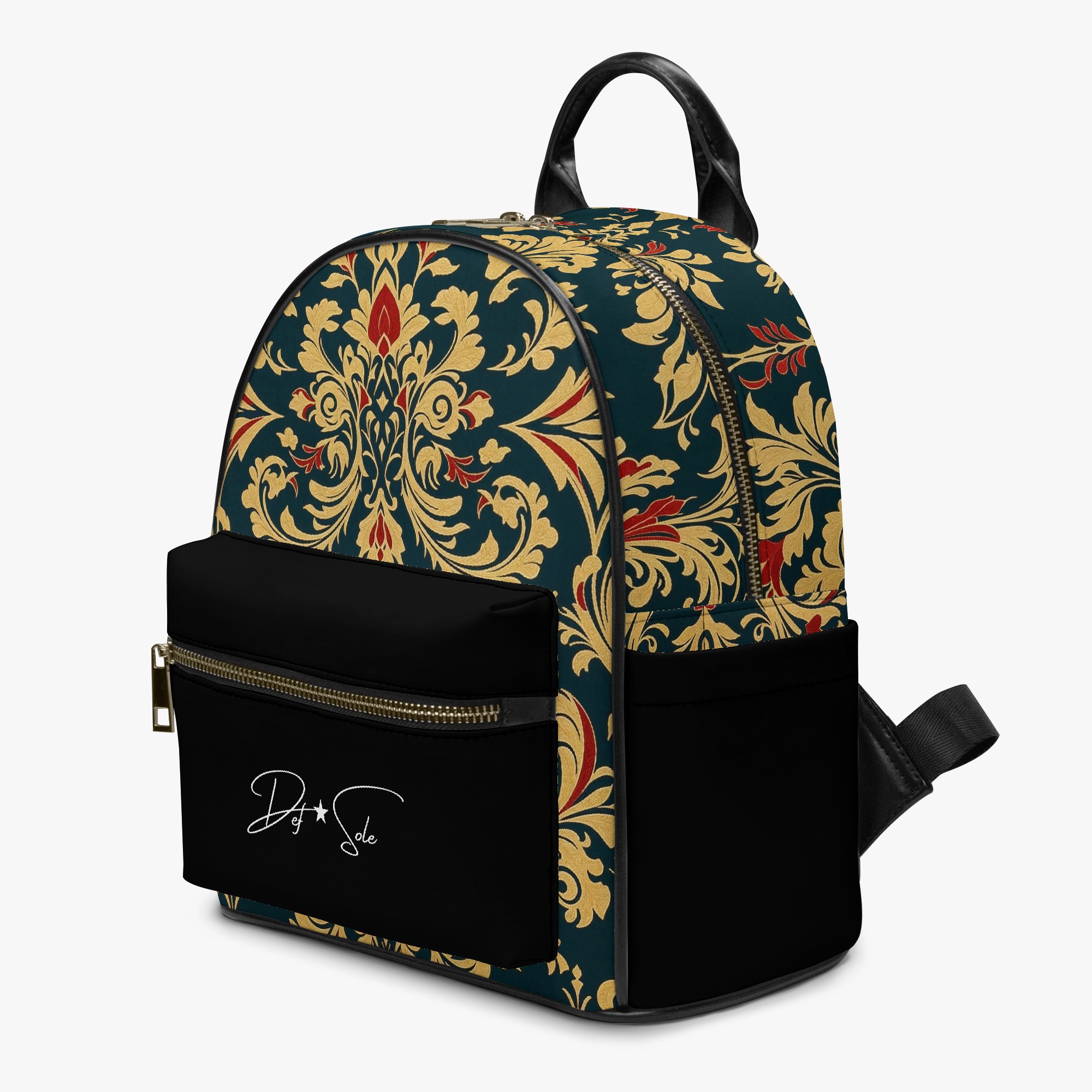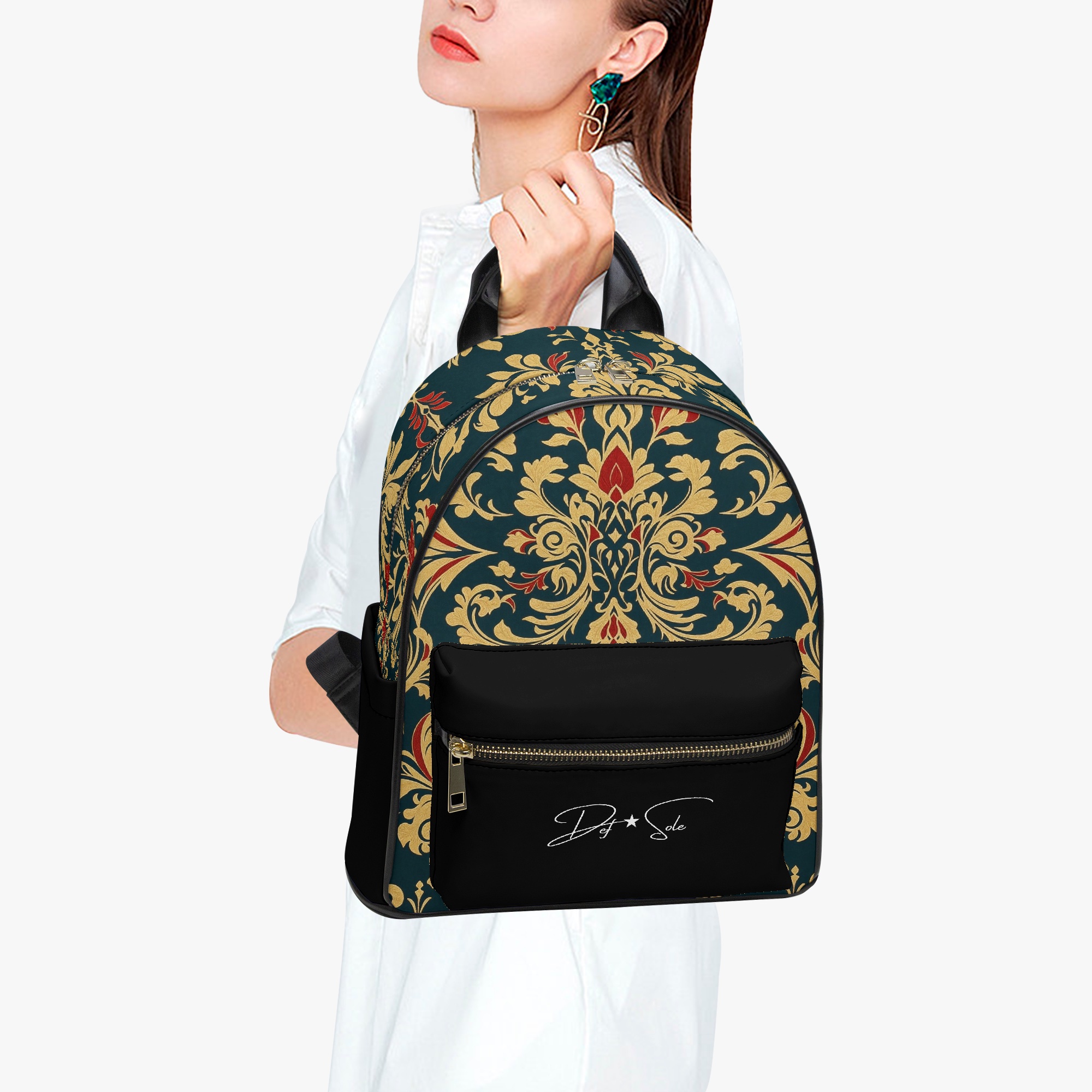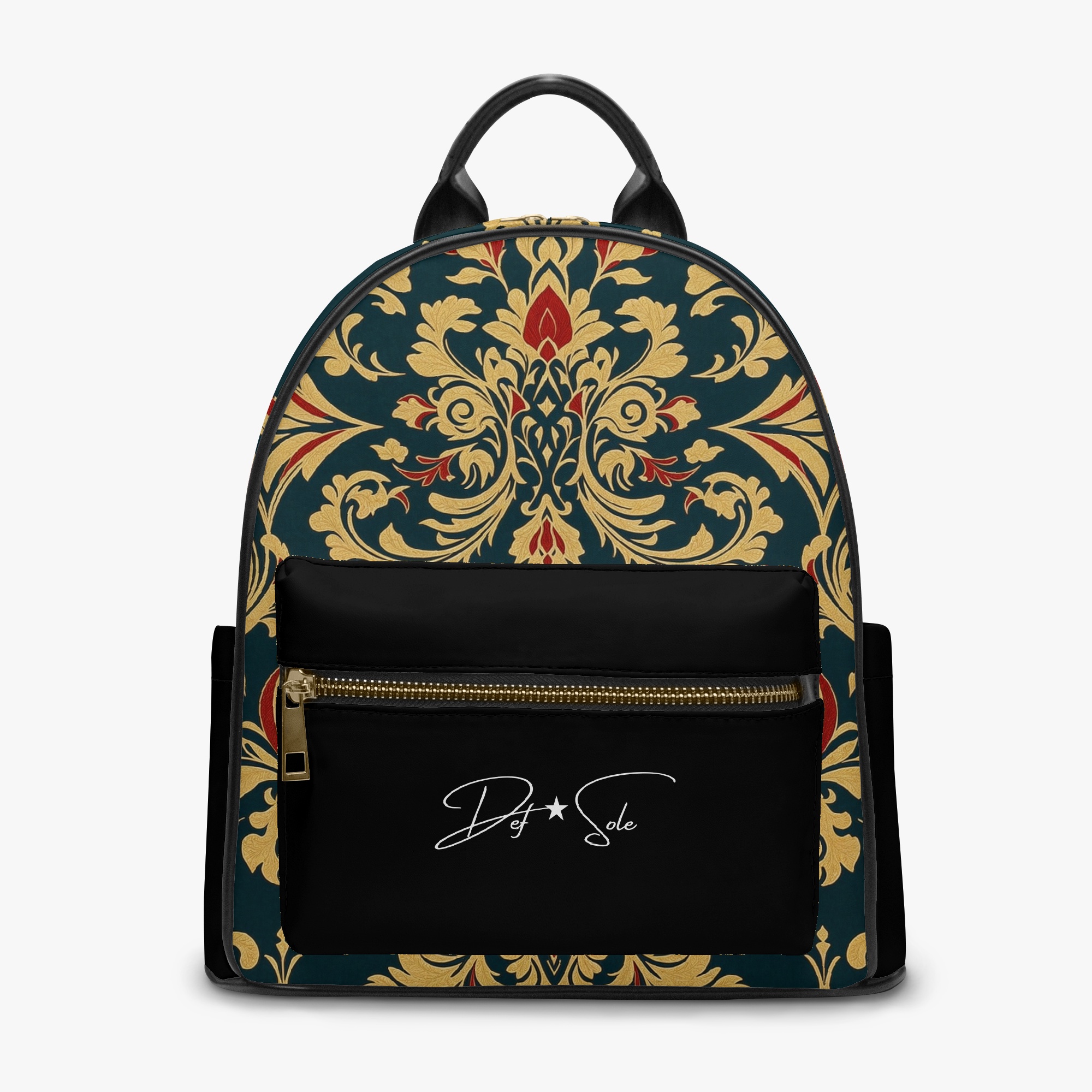 Elevate your everyday style with the Def Sole Signature Backpack. This luxurious leather bag combines timeless elegance with modern functionality, featuring a striking baroque-inspired pattern in gold and red on a rich green backdrop. The sleek black leather accents and gold-tone zipper details add a touch of sophistication.