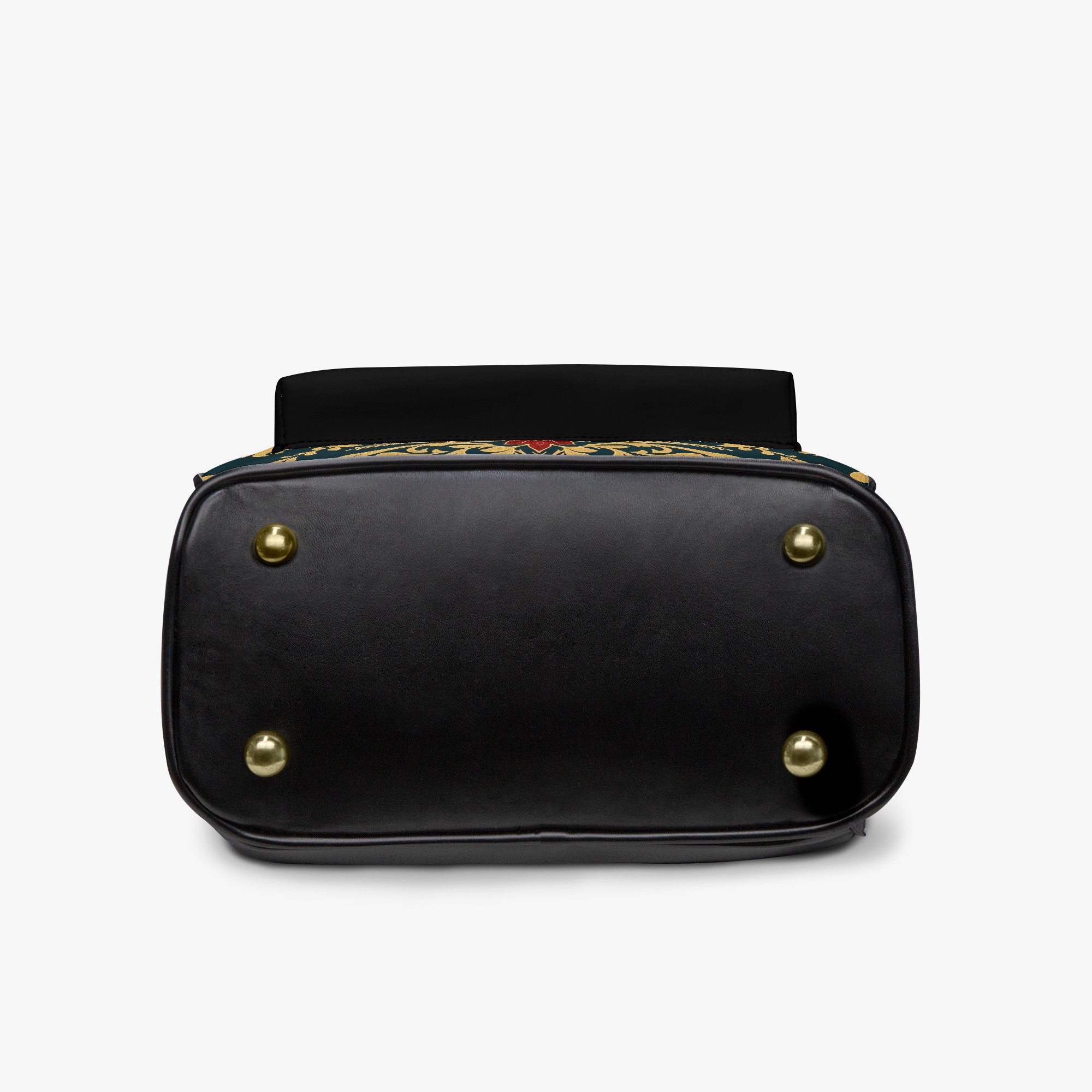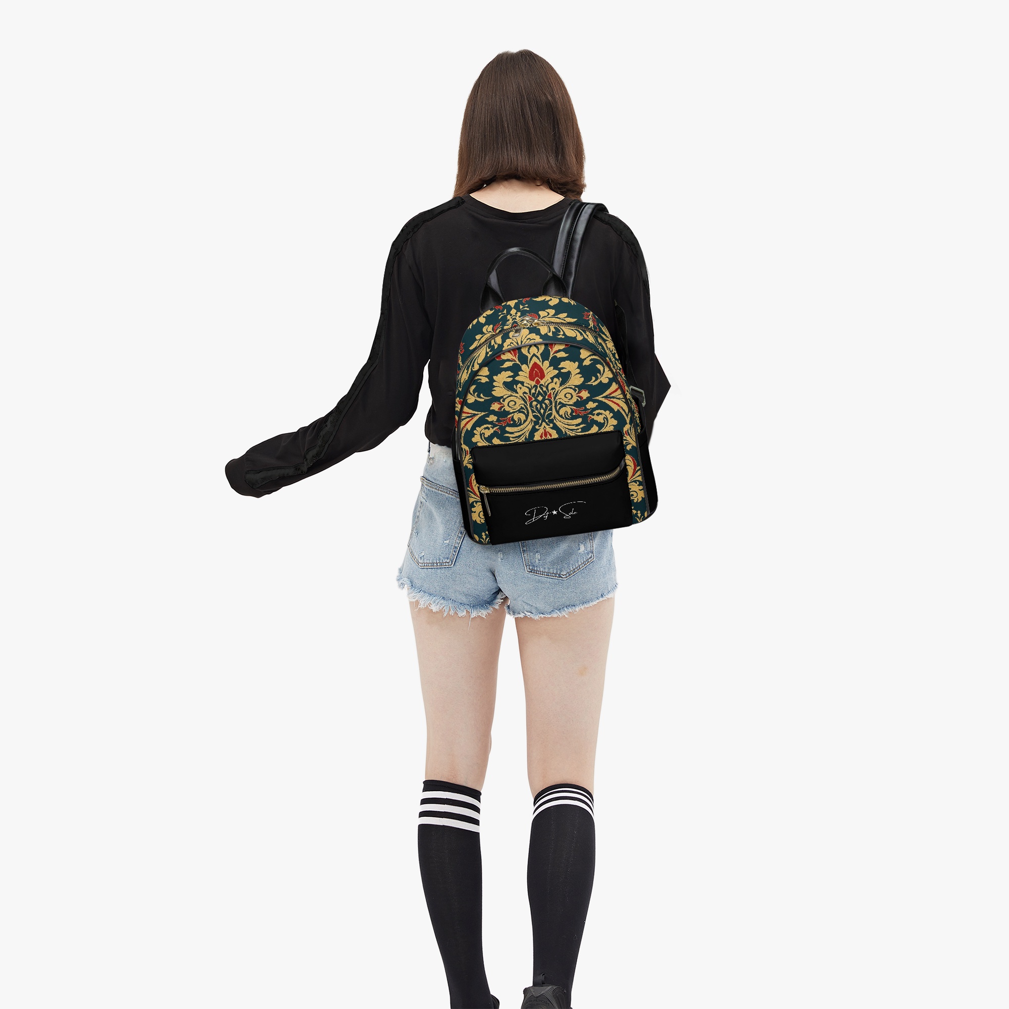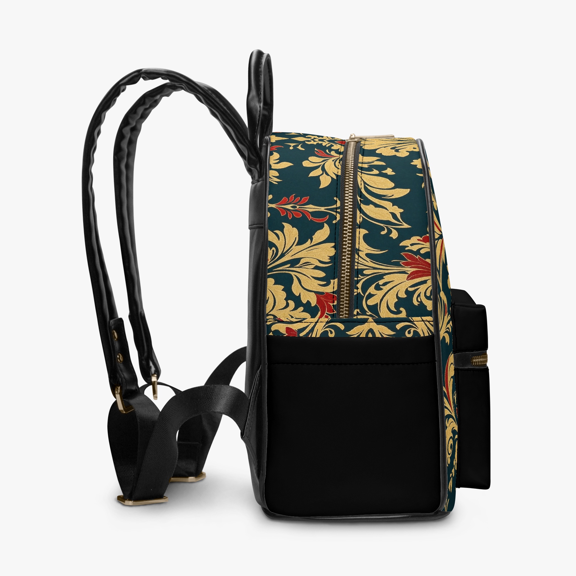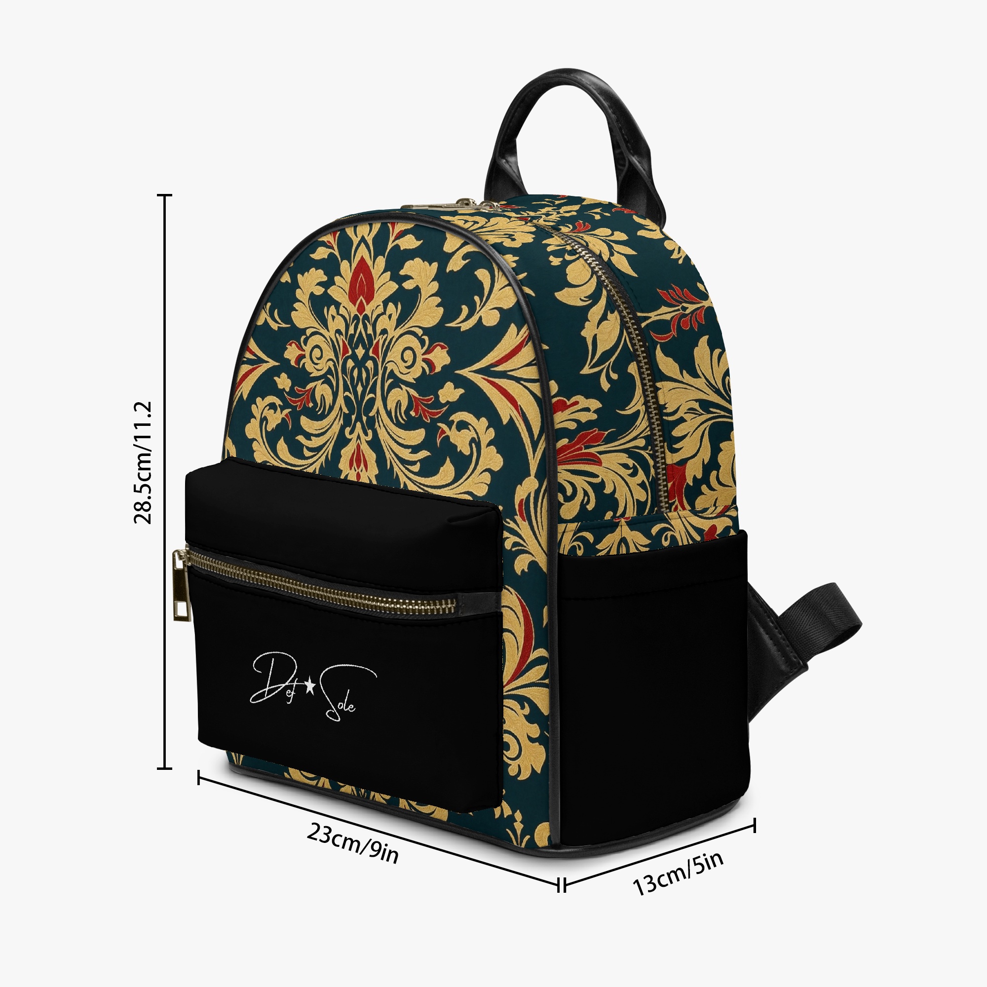 Elevate your everyday style with the Def Sole Signature Backpack. This luxurious leather bag combines timeless elegance with modern functionality, featuring a striking baroque-inspired pattern in gold and red on a rich green backdrop. The sleek black leather accents and gold-tone zipper details add a touch of sophistication.
