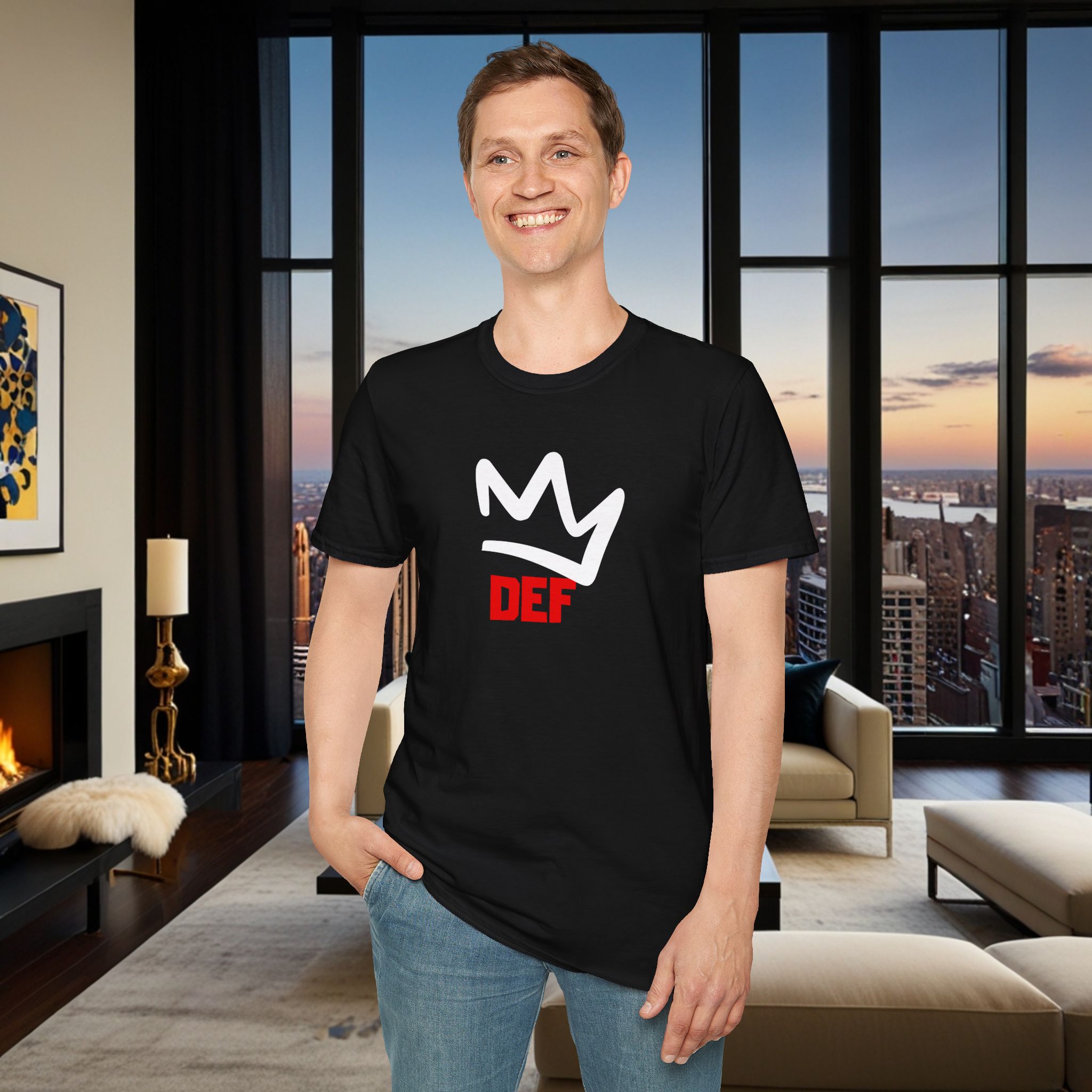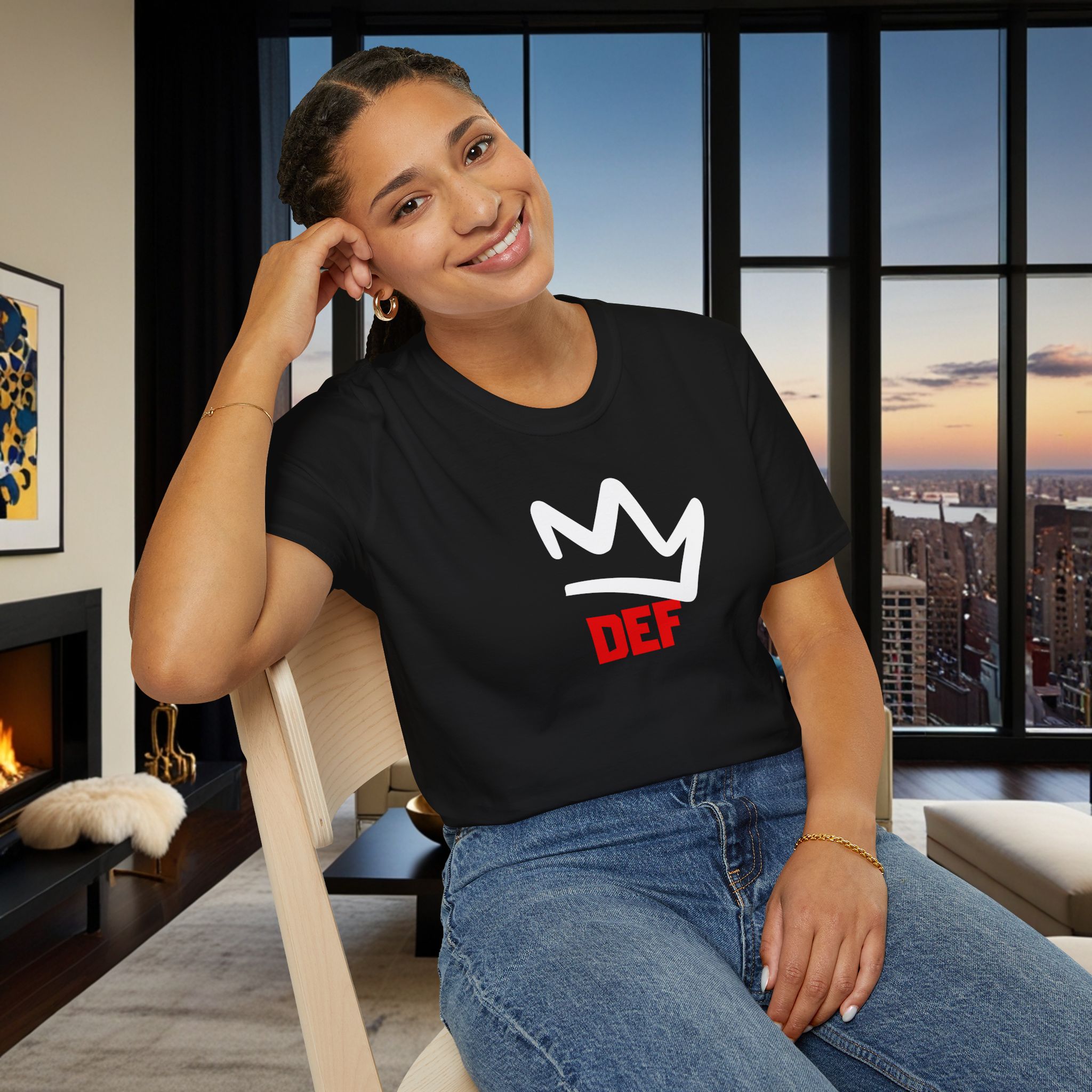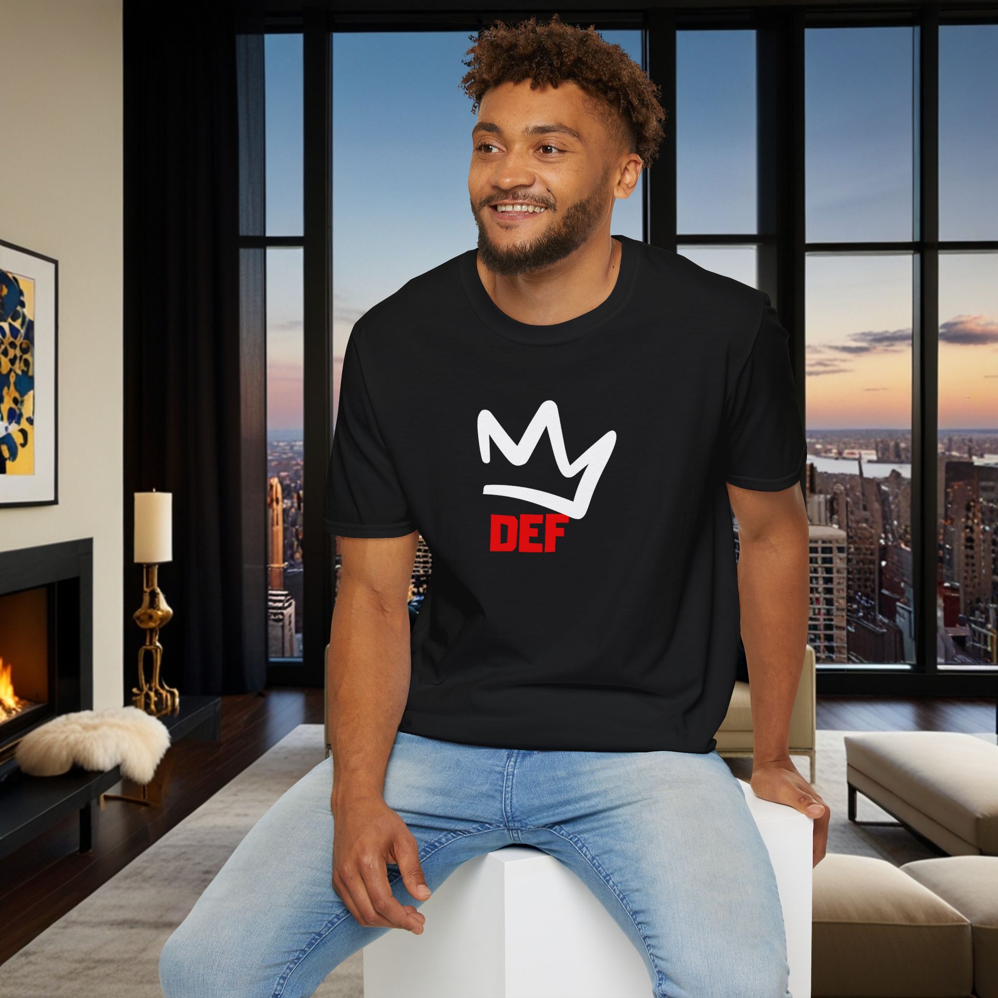 Def Sole Sneaks Brand DEF CROWN Tee. Made from very soft materials, this tee is 100% cotton for solid colors. Heather colors and sports grey include polyester. The shoulders have twill tape for improved durability. There are no side seams. The collar is made with ribbed knitting to prevent curling damage.