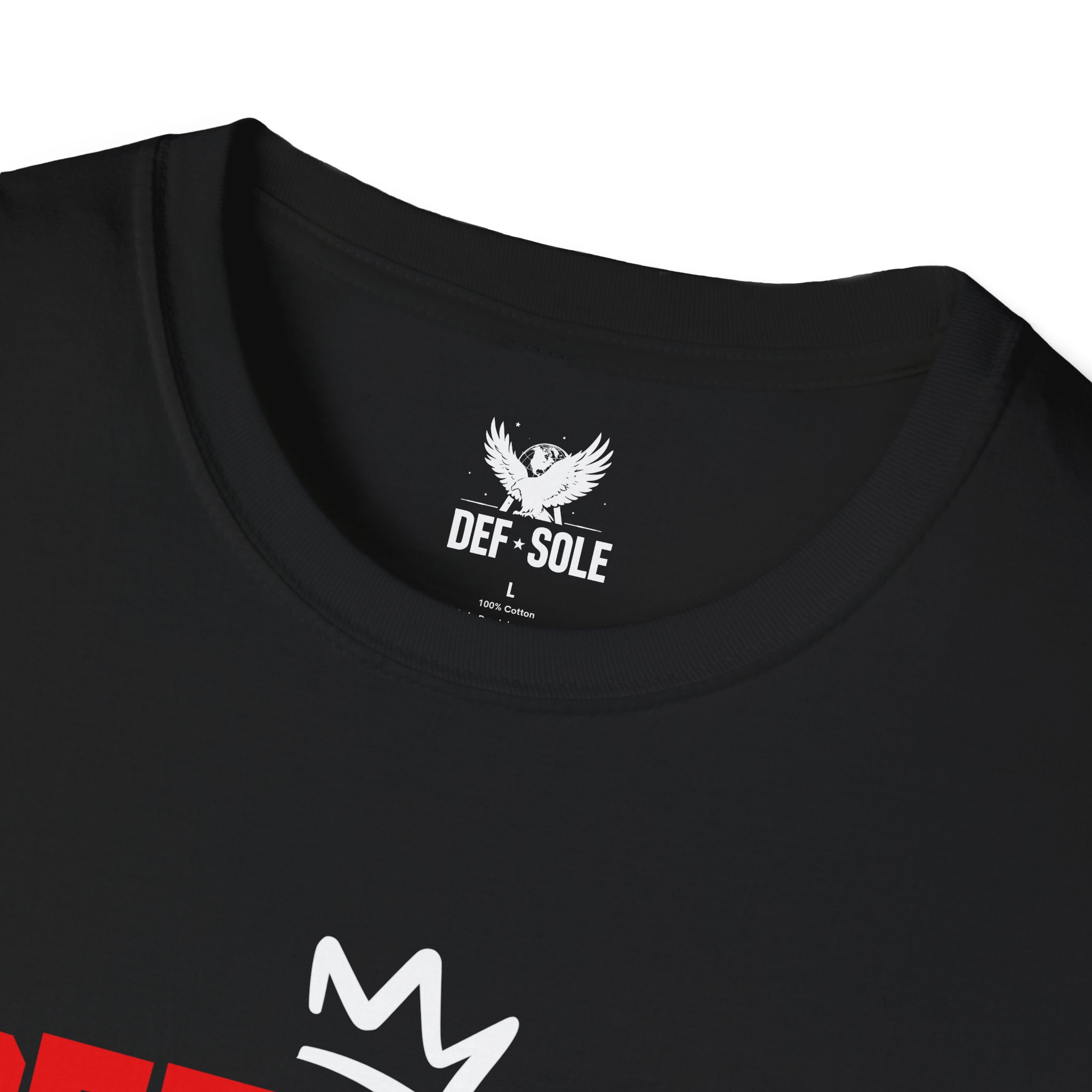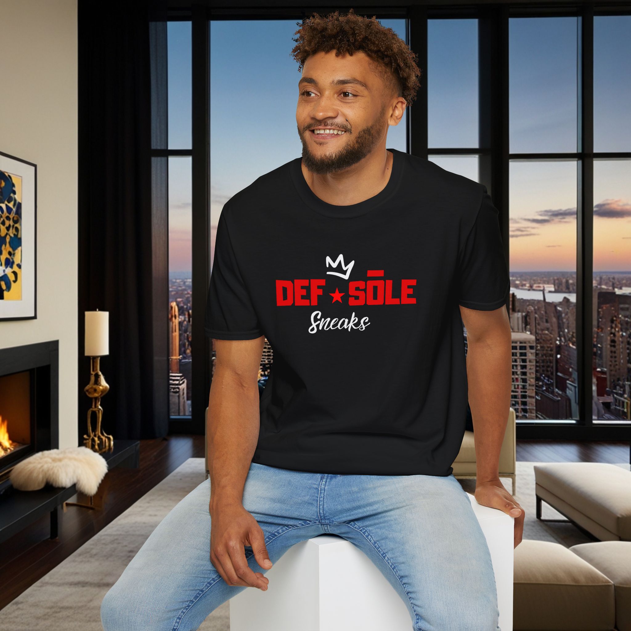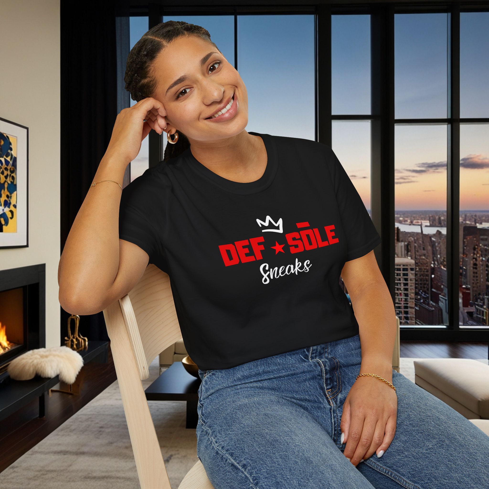 Def Sole Sneaks Brand Tee. Made from very soft materials, this tee is 100% cotton for solid colors. Heather colors and sports grey include polyester. The shoulders have twill tape for improved durability. There are no side seams. The collar is made with ribbed knitting to prevent curling damage.