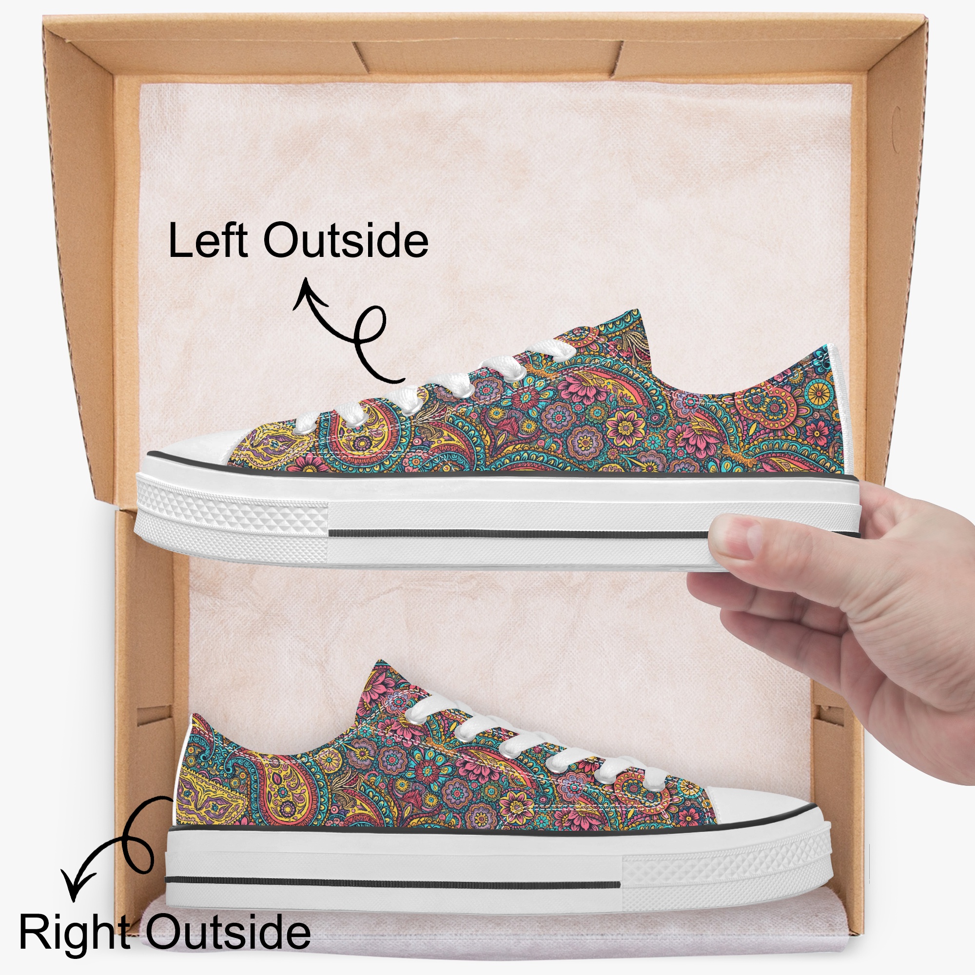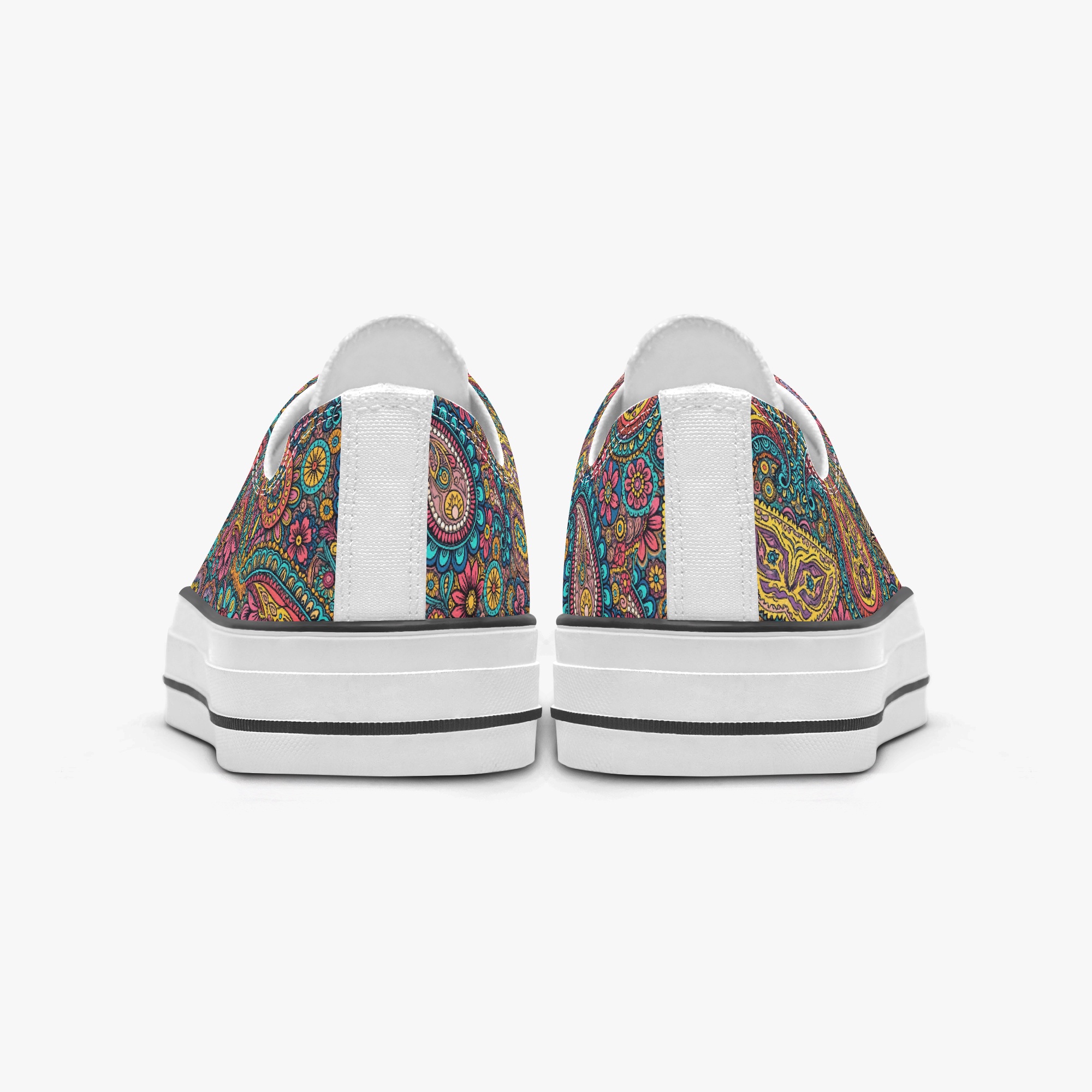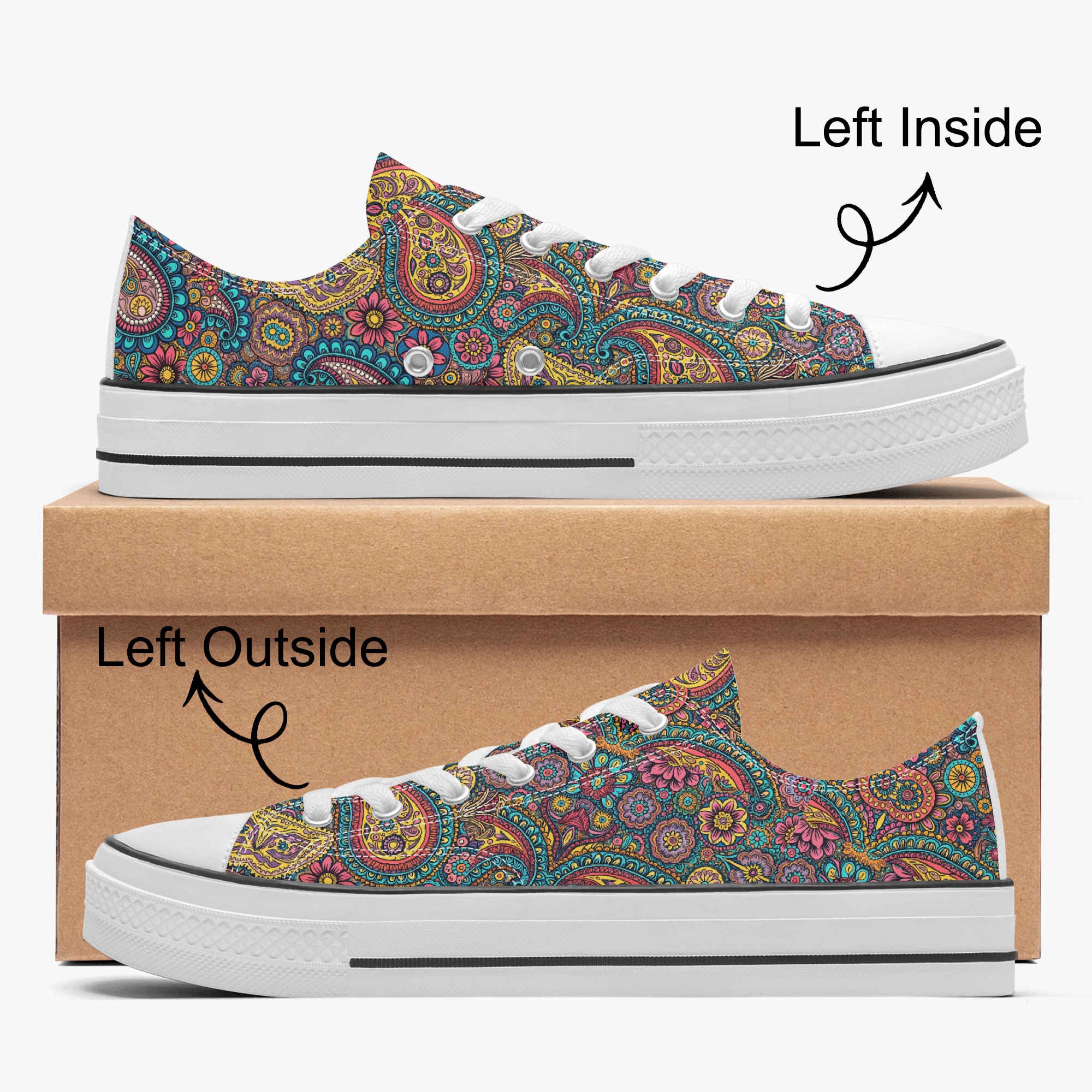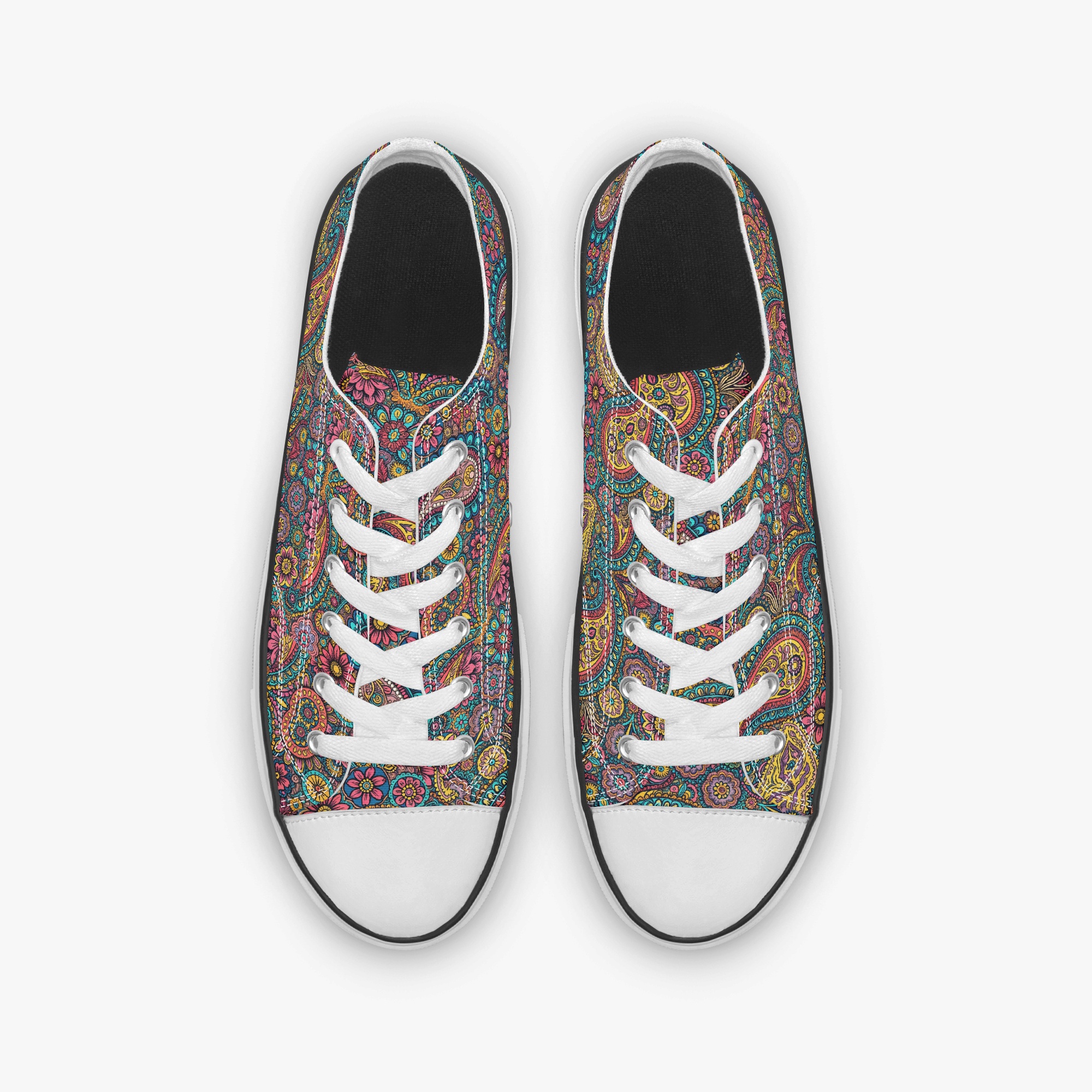Step into a world of vibrant colors and intricate patterns with our Paisley Seraphine Low-Top Sneaks. These eye-catching shoes feature a mesmerizing paisley design that’s sure to turn heads. The bold and colorful palette creates a striking visual effect, while the classic high-top silhouette offers a comfortable and stylish fit.