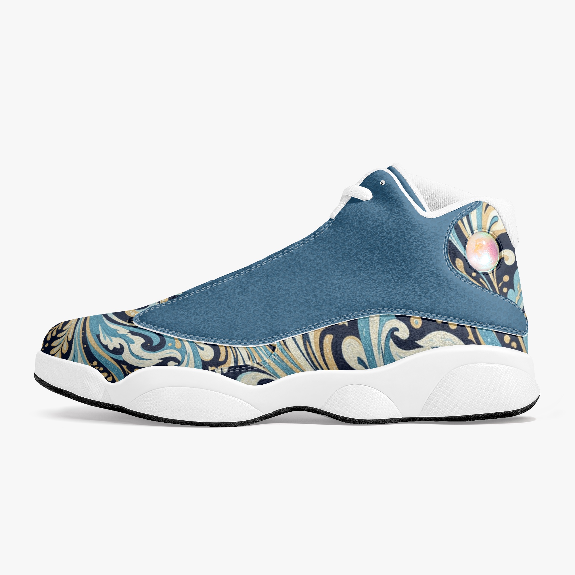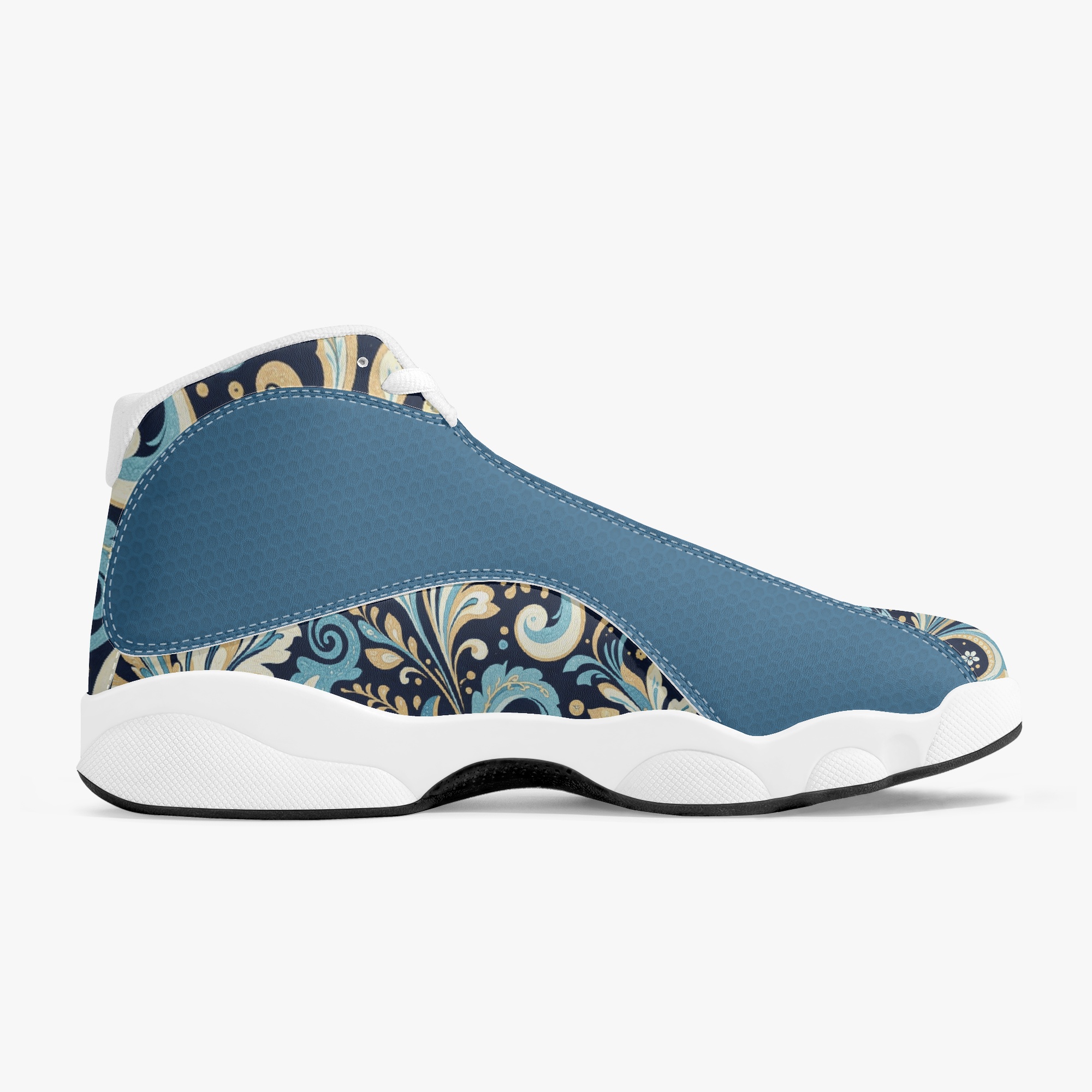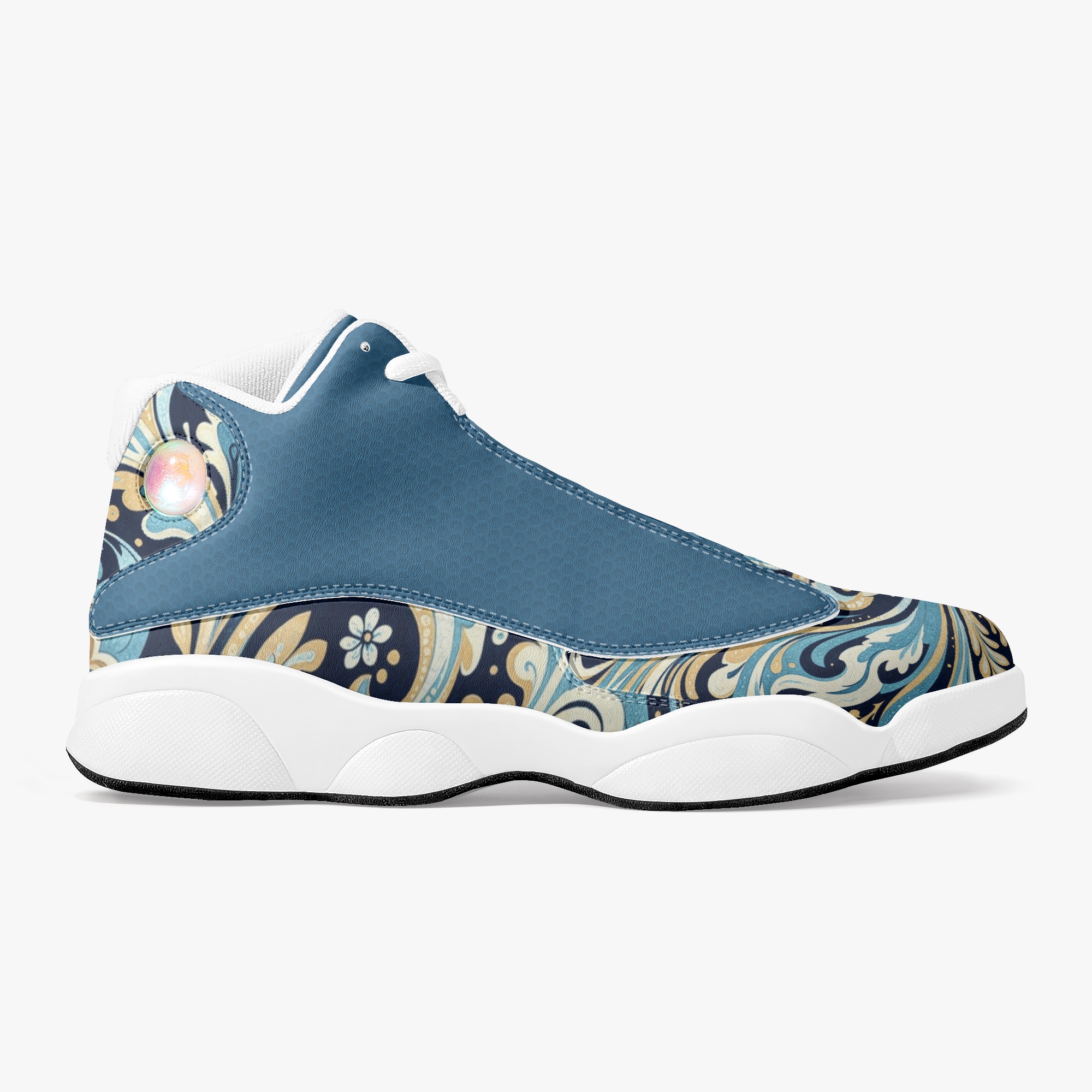Slide into a world of fluid elegance with the “Vault” High-Top Basketball Sneaks in Liquid Paisley. These captivating kicks feature a mesmerizing paisley pattern that resembles swirling liquid, creating a dynamic and eye-catching design. The intricate details and bold colors evoke a sense of movement and energy, while the premium leather construction offers durability and a luxurious feel.