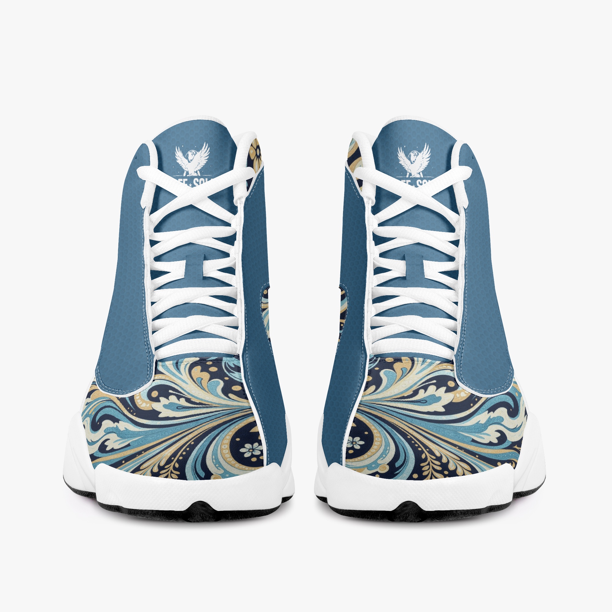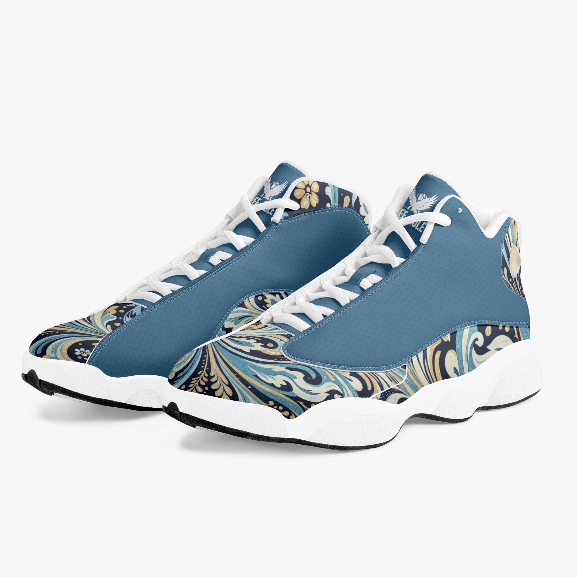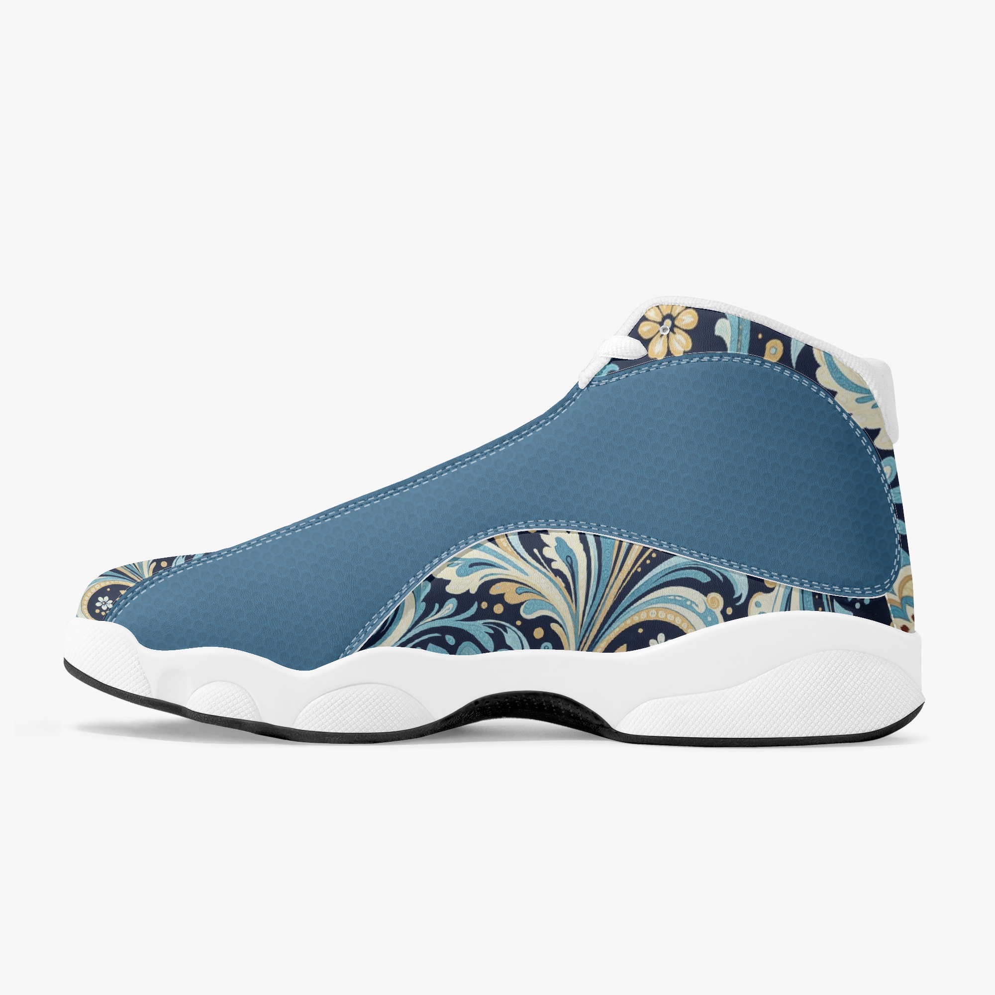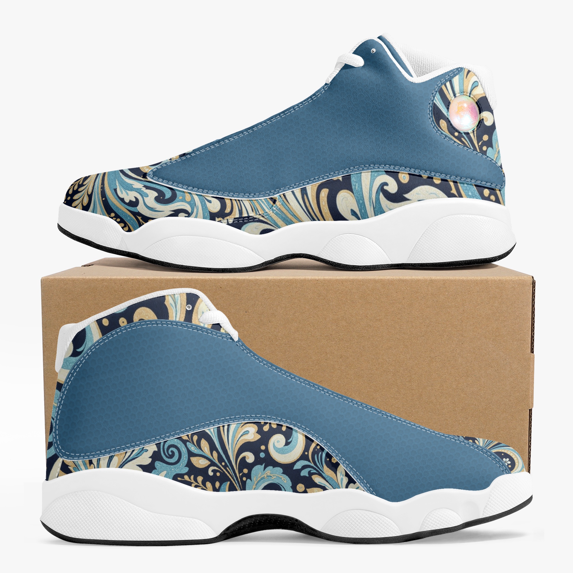 Slide into a world of fluid elegance with the “Vault” High-Top Basketball Sneaks in Liquid Paisley. These captivating kicks feature a mesmerizing paisley pattern that resembles swirling liquid, creating a dynamic and eye-catching design. The intricate details and bold colors evoke a sense of movement and energy, while the premium leather construction offers durability and a luxurious feel.